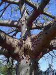 The following description refers to Adansonia only. Tree, with an extraordinary swollen trunk. Stipules present, deciduous. Leaves alternate, simple (in young trees) or digitate (in older trees). Flowers large and showy, pendulous, solitary in leaf axils, bisexual, actinomorphic. Pedicels with 2 bracteoles. Calyx deeply 5-lobed (in ours), often with an epicalyx. Petals 5, free. Stamens numerous, united into a tube below (in ours); anthers 1-thecous. Ovary superior, 5-10-locular (in ours). Fruit woody, indehiscent (in ours). Comment: According to the most recent taxonomic research by the Angiosperm Phylogeny Group (APG-III), Malvaceae sensu lato now includes Bombacaceae, Tiliaceae and Sterculiaceae, three families traditionally considered separate but closely related. In this new concept Malvaceae would consist of the following nine subfamilies: