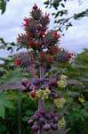 Monoecious, glabrous, annual or perennial, herb, shrub or even small tree. Stipules united to form a caducous sheath. Leaves alternate; petiole with glands at base and apex; lamina peltate, palmately-lobed, the lobes glandular-serrate. Inflorescences paniculate; male flowers in lower half, female in upper. Male flowers: pedicels jointed, with 2 bracteoles; calyx with 3-5 valvate lobes; petals and disk 0; stamens numerous; pistillode 0. Female flowers: pedicels elongating in fruit; sepals 5; petals and disk as for male; ovary 3-locular; ovules 1 per loculus; styles 3, dark red. Fruit 3-lobed, smooth or echinate with accrescent spines, dehiscing into three 2-valved cocci leaving a prominent, persistent columella. Seeds smooth, mottled. Derivation of name: from Latin ricinus meaning bug or tick, referring to the seeds Worldwide: 1 species in East and Northeast Africa and Middle East, naturalised throughout the tropics Zimbabwe: 1 cultivated taxon. |