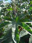 | Description: | Robust, hairless annual or perennial herb, shrub or even small tree. Stipules united to form a sheath. Leaves alternate, peltate, palmately-lobed, the lobes with glandular teeth. Inflorescences paniculate; flowers unisexual in the same inflorescence; male flowers in lower half, female in upper. Male flowers with pedicels jointed, with 2 bracteoles; calyx with 3-5 lobes; petals and disk absent; stamens numerous. Female flowers with pedicels elongating in fruit; sepals 5; petals and disk absent; ovary 3-locular, each with one ovule; styles 3, dark red. Fruit 3-lobed, smooth or covered in spiny bristles, splitting into three 2-valved parts. Seeds smooth, mottled. |