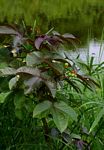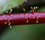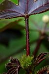 | Description: | Multi-stemmed shrub. Stems and branches hollow, purple, covered in stalked glands (image 3). Leaves crowded near the ends of branches, palmately 3-5-lobed, dark purple when young, turning olive-green with age, margins and petioles with hair-like stalked glands. Flowers in terminal clusters, deep red with a yellow centre. Fruit a 3-lobed capsule. |