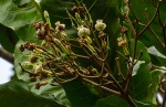 | Description: | Tall straight-stemmed evergreen tree. Leaves very large, clustered near the ends of branches, obovate-oblong, stiff and leathery. Flowers in terminal branched clusters, trumpet-shaped with reflexed petals, creamy-white with a greenish tube. Sepals 5-8 mm long, green, rounded. Corolla white with 11-13 lobes. Stamens as many as the corolla lobes, equal, with short filaments. Fruit fleshy, near-spherical, smooth. |