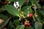 | Description: | A free-standing tree (in cultivation), sometimes becoming very large (to 22 m tall). Leaves: petiole 8-20 mm long, glabrous; lamina leathery, narrowly to broadly elliptic, 27-80 × 15-45 mm, with obscure venation above. Fruit 7-15 mm in diameter, sessile, creamy-green turning pink, red or orange when ripe, sometimes with warts or spots. Basal bracts in threes. |