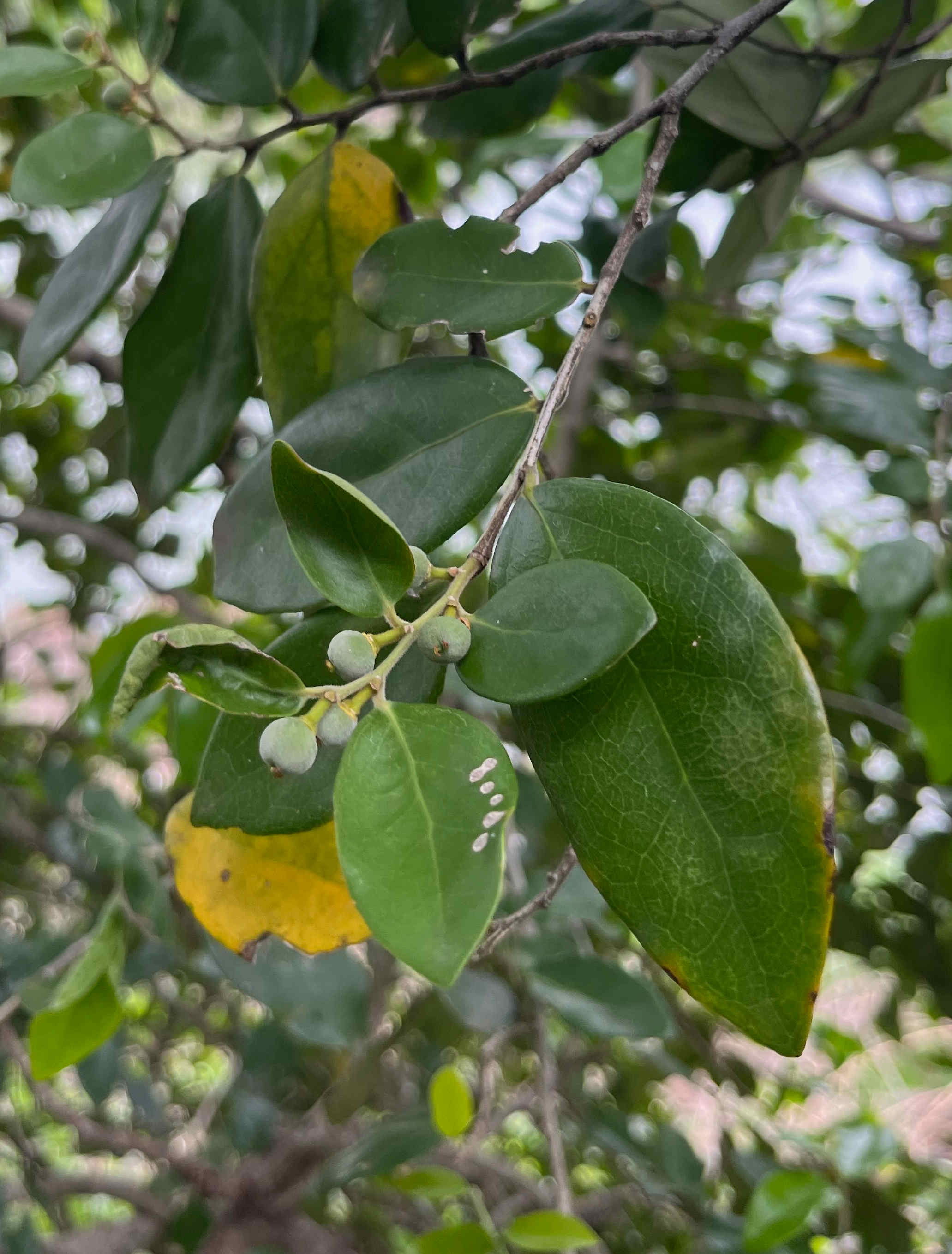 Small immature fruit and creamy-white flowers. |