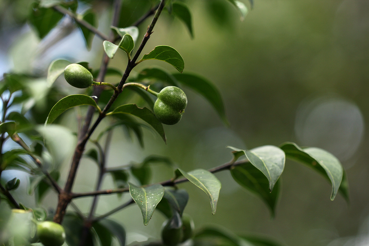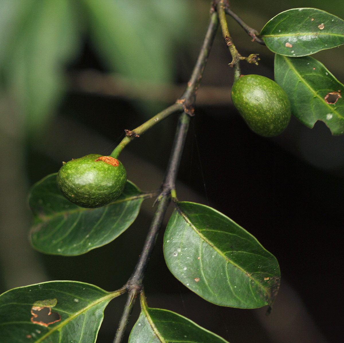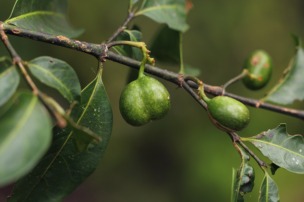 | Image notes: | Small, slender tree, c. 2.5 m tall; stem with straight spines in whorls of 3; leaves dark green, leathery; fruit irregularly 2-lobed, mottled green. Only one specimen seen |
