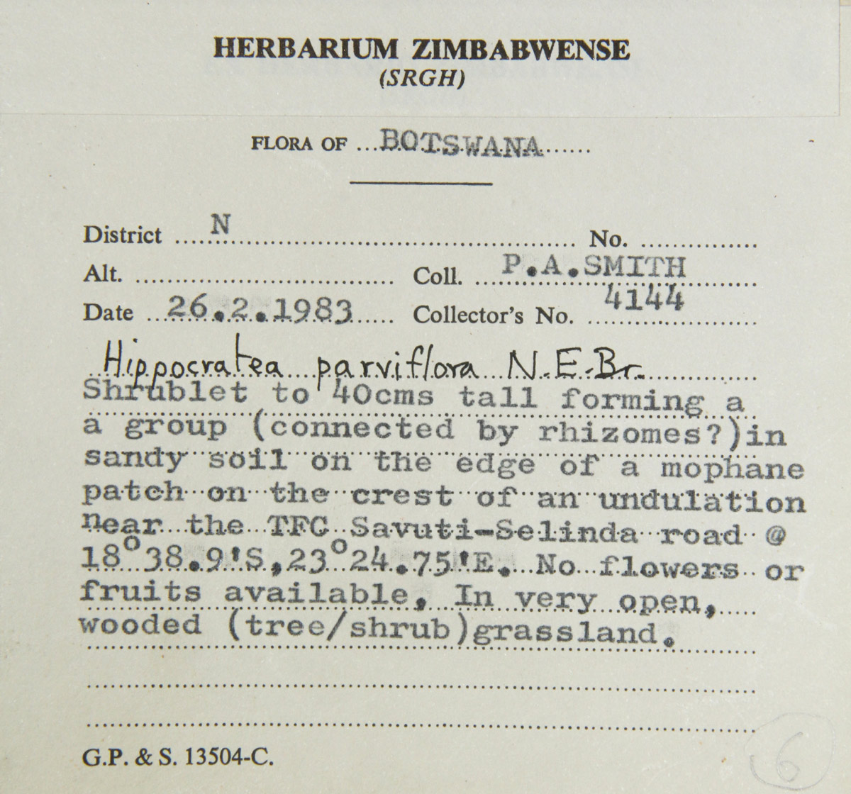 In sandy soil on the edge of a Mopane patch on the crest of an undulation. |