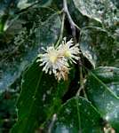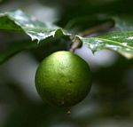 Shrub or small evergreen tree with spreading, drooping branches. Leaves alternate, oblong, 7-16 cm long, leathery and very glossy above; margin sharply toothed wit the forward pointing teeth; petiole up to 1.2 cm long. Flowers in short axillary inflorescences up to 2 cm long. Sepals 4-5, orbicular, 1.5-3.5 mm wide. Petals whitish-green, about twice the size of the sepals; stamens numerous, c. 8 mm long, white. Fruit globose, c. 2.5 cm in diameter, style persistent as a short point, yellow when ripe.