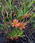 Glabrous subshrub, 10-40 cm, from a woody rootstock. Leaves decussate, sessile; lamina linear-lanceolate, glaucous, 1-nerved; base rounded, truncate or subcordate; apex acute. Dichasia (1-)3-flowered; peduncle slender, to 15 mm; bracteoles 1.5-2 mm, linear-lanceolate; pedicels of lateral flowers 1-2 mm. Flowers 6-7(-8)-merous. Calyx tube 3-4.7 mm, cup-shaped; lobes 0.8-1 mm; appendages very short. Petals 2.5-5 mm, orange, pink with red mid-line, pale red or red. Stamens 12-14(-16), unequal, exserted. Style 8-9 mm. Capsule 3-3.5 mm in diameter, spherical. |