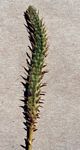 Stem branched, up to 6 mm in diameter, creeping on the ground for most of its length, rooting along their length. Leaves dimorphic; lateral leaves fleshy, spreading, oblong to sickle shaped, 15 × 3 mm, up to 3 times larger than the dorsal leaves; dorsal leaves appressed, ovate to lanceolate, up to 4 × 3 mm. Strobili solitary, borne at the apex of an erect peduncle; peduncle sparsely set with reduced appressed leaves, 7 - 30 cm long. Sporophylls broadly ovate-acuminate with a deflexed point, up to 5.5 × 2 mm. |