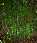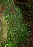 Rhizome fairly thick, shortly creeping; rhizome scales narrowly lanceolate, with or without a short hair-tip, dark brown, c. 3.5 mm long, margins ciliate. Fronds simple, spaced 3-10 mm apart, coriaceous, arching or pendulous; stipe castaneous to black, up to 3 cm long. Lamina up to 35 × 0.6 cm, narrowly elliptic to linear, apex tapering to a point, base tapering, midrib obvious below but not raised, veins obscure. Sori in two submarginal grooves up to 0.6 mm from the margin; indusium continuous, along both sides of the soral line. |