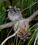 Tree, to 40 m. Leaves 15-22 cm, light green, in bundles of 3(-5), pendulous; basal sheath persistent. Female cones 7-10 cm, ovoid-conic, slightly curved, lateral, subsessile, in clusters of 2-5. Seeds 5 mm, triangular; wing 12-20 mm. |