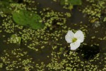 Aquatic herb, 20-50 cm high. Leaves submerged when young, floating or even erect above the surface of the water, more or less broadly ovate, 3.5-13.5 cm long, 1.5-2.5 times longer than wide, leathery with 5-7 prominent longitudinal veins; margin entire and smooth; petiole distinct, 9-45 cm long, triangular in cross-section. Inflorescences unisexual on different plants, rarely on the same plant. Male inflorescences with peduncle 6-47 cm long, spathes ovoid, oblong or lanceolate, 3.5-7.5 cm long, flattened, often 2-winged. Flowers 6-40 per spathe, 1-4 opening at the same time, pedicels exserted c. 4 cm above the spathe; sepals lanceolate, 8-12(-21) mm long, with darker veins and tips; petals obovate, white with cream or yellowish base. Female inflorescences with peduncle 16-20.5 cm long, spathes narrowly ovoid, 3-6 cm long, unwinged, grooved with c. 10 darker longitudinal stripes, smooth or with very small prickles. Flowers 1 per spathe, exserted 6-17 cm above the spathe; sepals oblong-lanceolate, 8-16(-23) mm long; petals obovate, white with yellowish base. Fruit spindle-shaped, 2.5-4 cm long. |