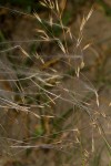 Tufted perennial grass, up to 80 cm high. Culms erect, simple, sometimes branched in the upper part, scaberulous or almost hairless, 2-5-noded; nodes hairless. Leaf-sheaths finely scaberulous, slightly compressed, with broad hyaline margins, the lower ones reduced to scales, the upper ones tight. Ligule a short-ciliate rim; auricles densely barbate; collar glabrous. Leavef-laminae 6-20 cm long by c. 1 mm, scaberulous or hairy above, with a few long hairs near the base, scaberulous beneath. Panicle 30 x 20 cm, effuse and open, with long branches bearing spikelets on long pedicels. Spikelets pallid or purplish-brown. Glumes nearly equal; the inferior 9-11 mm long, rounded or slightly keeled, with a short mucro; the superior 10-13 mm long, slightly 2-fid or emarginate, with a short awn from the sinus. Lemma c. 3.5-4 mm. long (including the callus), conspicuously tuberculate, especially towards the apex, tapering gradually into a column; central awn 5-7 cm long, plumose; lateral awns up to 2.5 cm long, very delicate, naked. |