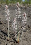 Perennial herb up to 25 cm high, 1-several growing points developing from a globose tuber. Leaves 1-2 per growing point, elliptic to lanceolate up to 10 cm long, bright green, hairless; leaf sheath above ground for up to 50 mm, dark red, becoming paler towards the leaf blade. Inflorescences 1-2 per growing point on a peduncle up to 20 cm long, 12-15-flowered. Flowers urn-shaped, c. 12 mm in diameter with tepals recurved, white to pale pink with a broad red-streaked mid-vein; stamens white. Capsule ovoid 6-8 mm long, emarginate; tepals persistent. |