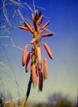 Succulent herb. Stems spreading to pendent, up to 1 m long. leaves crowded towards the apices of the stems, 2-ranked, pendent, up to 40 cm long. Inflorescence with peduncle curved upwards. Raceme erect, laxly flowered, 6-10 cm long, cylindric; bracts up to 25 × 10 mm, broadly ovate, orange-brown. Flowers 30-37 mm long, 3-sided-cylindric, narrowing towards the mouth, bright red, green-tipped. |