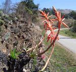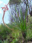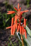 Perennial herb, solitary, or suckering to produce a cluster of up to 4 stems. Leaves mostly in a basal rosette, erect, fleshy but grass-like, linear, 30–50 cm long, dull green, with a few whitish spots toward the base of the under surface; margin with firm white teeth near the base. Inflorescences 1–3 from each rosette, simple, erect up to c. 50 cm high, rarely taller when protected from fire. Raceme cylindric, 15–20 cm long and 8 cm, more or less laxly flowered; pedicels c. 3 cm long, elongating to 5 cm in fruit. Perianth salmon-pink, greenish-tipped, c. 35 mm long and 6 mm in diameter across the ovary; outer segments free to the base with tips slightly spreading. This species often flowers early after fire, when the leaves and stem are burnt. |