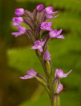 Slender terrestrial herb, up to 50 cm. Stem and inflorescence glandular hairy. Leaves near the base of the stem, lanceolate-elliptic. Inflorescence 5-many-flowered, often pyramidal at first, more elongated later. Flowers small, pink, mauve or purple; dorsal sepal forming a hood with the petals; lateral sepals spreading; lip linear-ligulate, entire; spur 3-5 mm long. |