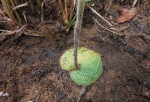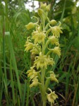 Terrestrial herb p to 35 cm high. Basal leaf one, apressed to the ground,broadly ovate to alomost circular, cordate at the base, up to 4 × 3.5 cm, dark green with creamy-white mottling, hairless or with scttered hairs on upper surface; margin ciliate. Stem pale green, densely pubescent with 3-4 small bract-like leaves. Inflorescence 3.5-7.5 cm long, fairly densely 3-11-flowered. Flowers non-resupinate, pale yellow. Dorsal sepal and lateral sepals ovate, pubescent; petals 2-lobed in the apical third; lip 8-10 mm long, 3-lobed about halfway with somewhat diverging lobes; spur 10-12, bent up, slightly swollen towards the pointed apex. |