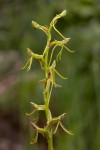 Very slender terrestrial herb, 20 to 65 cm. Leaves scattered along the stem. Inflorescence up to 20 cm, few to many-flowered. Flowers green. Dorsal sepal erect, hooding the anthers, lateral sepals deflexed. Petals entire, pressed against the dorsal sepal. Lip three-lobed to the base, all lobes linear, the mid-lobe slightly longer and broader than the side lobes. Spur 2 to 3.5 cm long, straight or slightly curved.