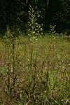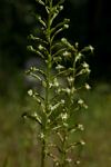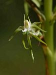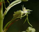 Robust terrestrial herb, up to 1 m. Leaves born along the stem, linear-lanceolate with 3 distinct longitudinal veins. Inflorescence many-flowered. Bracts leaf-like as long as or longer than the pedicel and ovary, at least at the base of the inflorescence. Flowers green, white in the centre. Sepals reflexed, ovate with a small pointed lobe on on side. Petals 2-lobed; upper lobes erect, linear; lower lobes pendent, lanceolate, at least twice as long as upper lobes. Lip 3-lobed, linear, mid lobe slightly longer than side lobes. Spur 15-30 mm, slender, inflated at the apex, often twisted in the middle. |