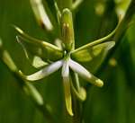 Terrestrial herb, up to 80 cm. Leaves along the stem, sheathing at the base. Inflorescence many-flowered. Flowers yellow-green; side lobes of the lip white at the base, covered in papillose hairs. Petals 2-lobed, upper lobes erect clasping the dorsal sepal, lower lobes up to 20 mm, curved upwards. Dorsal sepal erect, hooding the anthers. Spur up to 23 mm, recurved, somewhat twisted and swollen near the apex. |