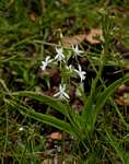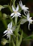 Short, slender terrestrial, 15 - 35 cm. Leaves along the stem but mainly near the base, leathery, linear-lanceolate, folded along their length. Inflorescence 10-30 flowered, large in relation to the stem. Flowers mainly white; sepals broad, grey-green, reflexed. Petals 2-lobed nearly to the base; both lobes lanceolate. Lip 3-lobed; mid-lobe longest; all lobes linear. Stigmatic arms prominent, knob-shaped at the apex. |
