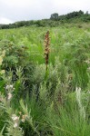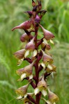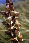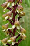 Terrestrial herb, up to 1 m tall. Leaves overlapping along the fertile stem, lanceolate to narrowly ovate, shortly sheathing at the base. Inflorescence 15-40 cm long, many-flowered. Bracts lanceolate, pointed as long as or overtopping the flowers. Flowers facing down, variable in colour, often more or less deep purplish on the outside of the hood and the base of the lip, greenish to silvery-white on other parts. Dorsal sepal deeply hooded with a more or less horizontal, cylindric spur, 1-2 cm long arising from the middle, decurved near the apex. Lateral sepals spreading. Petals more or less distinctly 2-lobed, 8-10 mm long, lying within the hood. Lip pendent, 5-10 mm long, fleshy. |