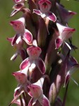 Terrestrial herb 30–90 cm tall. Leaves along the stem overlapping, mostly sheathing, lanceolate, 4–8 cm long. Inflorescence densely many-flowered, cylindric, 10–25 cm long. Floral bracts narrowly ovate to lanceolate, 1.5–2 cm long, overtopping the flowers. Flowers facing down, white with green or purple mottling on the sepals. Dorsal sepal elliptic-ovate, forming a hood 5.5–6.5 mm long, 4–4.5 mm wide and c. 2 mm deep. Spur cylindric, 9–11 mm long, horizontal from a small conical base, soon decurved. Lateral sepals oblong, 5–5.5 mm long. Petals oblong, 4.5–5 mm long. Lip obovate-spathulate, 3–5 mm long. |