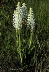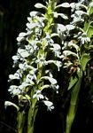 Robust terrestrial herb up to 1 m tall. Leaves 8-10, lowest sheath-like, next 2-4 large, up to 28 × 7 cm, broadly lanceolate; remaining leaves much smaller, becoming bract-like along the stem. Inflorescence 10-24 cm long, fairly densely many-flowered. Bracts up to 25 mm long, reflexed. Flowers white, sometimes flushed with pink. Sepals and petals pointing forward. Lip convex, forming a wide-mouthed hood; spurs 30-65 mm long. |