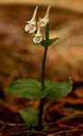 Slender terrestrial herb, 10 - 27 cm. Leaves 2, sub opposite. Inflorescence terminal, 1-4-flowered with leaflike bracts below the ovaries. Flowers white, spotted with green or purple. Dorsal sepal forming a elongate, tubular, spur-like hood. |