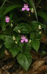 Terrestrial herb, up to 25 cm. Leaves 2, opposite, ovate, dark green. Inflorescence usually 1-3 flowered. Flowers pale to deep pink, with darker markings in the hood, sometimes almost white. Dorsal sepal joined with the petals to form an broad, open hood. Lateral sepals spreading, each with a sac-like spur. Lip with limb and appendages glabrous.