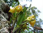 Epiphyte or occasional lithophyte, forming small clumps. Pseudobulbs ovoid to conical, 2-3 leaved. Leaves oblong-lanceolate, up to 11 cm, often tinged with purple. Inflorescence 2-6 flowered. Flowers yellow to yellow-green; lip 3-lobed, strongly recurved, white with purple-pink edgings on the side lobes. |