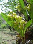 Epiphyte or lithophyte. Pseudobulbs more or less conical, 3-4-leaved. Leaves oblanceolate, up to 15 cm, slightly 2-lobed at the apex. Flowers fleshy, pubescent on the outside. Petals and sepals pointed, greenish-yellow or lemon-yellow. Lip very fleshy, white with purple veins on the side lobes. |