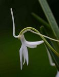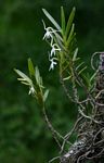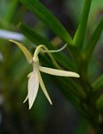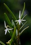Monopodial epiphyte or lithophyte. Stems normally erect with 6-16 leaves towards the apex. Leaves rather fleshy, stiff, held at an angle to the stem, unequally bi-lobed at the apex. Flowers singly (rarely 2) in the leaf axils, 4-5 cm in diameter, turning yellowish when fading, sweetly scented. Sepals and petals narrowly lanceolate. Dorsal sepal erect or recurved. Lip rhombic from a narrow base with a long pointed apex. Spur very slender, 2-3 cm, bent near the base. |