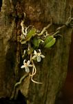 Epiphytic herb. Leaves 2-8, oblanceolate to obovate, leathery or slightly fleshy. Inflorescences horizontal or pendent up to 30 cm with up to 24 flowers. Flowers white, pink tinged in the spur with the lateral sepals strongly reflexed. Spur usually 6-8 cm long, curved forwards. See A. appendiculata for comparison. This species can be very variable in size. This is apparently not always related to differences in habitat, as smaller and larger plants seem to retain their sizes when grown together in cultivation (La Croix, 1997). |
