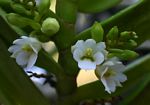 Robust epiphytic herb, occasionally recorded as a lithophyte. Plants develop a mostly unbranched stem, which stands out horizontally or somewhat pendent from the host tree. Leaves all along the stem, fleshy, distichous. Inflorescences in the leaf axils on the underside of the stem, c. 5-7-flowered. Flowers white with a greenish-yellow throat, lemon scented. Sepals and petals similar, ovate-elliptic. Lip 3-lobed with rounded side lobes. Spur greenish with a wide mouth, constricted in the middle, the spherical apex often at right angle to the base of the spur. |
