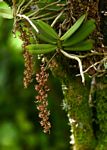 Pendent epiphyte or rarely lithophyte. Stem up to 40 cm long; roots c. 2 mm in diameter, often lightly attached to the host. Leaves several, up to 12 cm long, linear to oblanceolate, unequally 2-lobed at the apex, olive green, leathery. Inflorescences 1-many, more or less pendent, arising from the stem between the leaves. Flowers from purple-khaki in more exposed situations (see photos) to pale creamy in deeply shaded forest. Dorsal sepal broadly ovate; lateral sepals sickle-shaped, 2-4.5 mm long; petals almost round, 1.5-2.8 mm long. Lip broader than wide, curved down and backwards. Spur 6-11mm slender, incurved. |