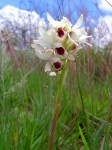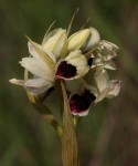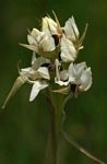 Slender terrestrial herb, up to 65 cm. Leaves 2-3, linear, 25-40 cm, sheathing at the base. Inflorescence short and crowded. Flowers usually white, sometimes dull yellow or maroon. The lip is always dark purple or violet and lacks a spur. |