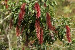 Large tree up to 25 m tall. Bark grey to pale brown, shallowly to deeply fissured, depending on exposure to fires. Leaves oblanceolate-oblong, often drooping, 6.5-12.5cm long, leathery, glossy green, hairless; margin entire but wavy; petiole up to 2 cm long, pink to red. Inflorescence a sturdy spike, 15-25 cm long. Flowers wine red to bright crimsom, turning silvery hairy when fruiting. |