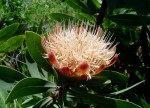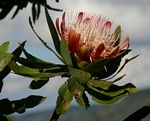 Shrub or small tree. The leaves are bluish-green, hairless, narrowly oblong or elliptic. Young leaves are bright red. Flower heads up to 15 cm in diameter; outer bracts usually brownish, inner bracts pink to red. |