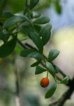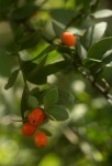 Mostly a large evergreen shrub but occasionally a small tree. Branches blue-green, erect and angular. Leaves alternate, lanceolate, 3-4.5 cm long, glaucous, thickly leathery, veining obscure; apex with a sharp tip; margin entire. Flowers in axillary clusters on long stalks, small, yellow-green; lobes 3. Stamens usually 3, rarely 4. Fruit c. 10 × 15 mm, yellow becoming red when ripe, crowned with the remains of the calyx. |
