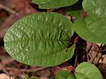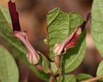 Perennial creeping or trailing herb with annual stems, up to c. 40 cm long, growing from a woody or fleshy rootstock. Leaves ovate-oblong, 1.5 - 10 cm long, hairless above, more or less hairy below, particularly on the veins, 3-7-veined from the base. Flowers solitary or 2-3 together, axillary; bracts leaf-like, up to 12 × 7 mm, ovate-elliptic to lanceolate. Perianth tube c. 20 mm long, greenish below, purplish above, swollen at the base; lip dark purple, narrowly oblong-elliptic, up to 3.5 cm long. Fruit a capsule, 1.5 - 3 m long, oblong cylindric, 6-ribbed, splitting into 6 segments while remaining on the plant, forming a "hanging basket". |