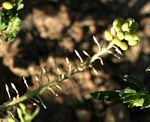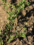 Annual or biennial herb with much-branched, prostrate or ascending, pubescent stems up to 50 cm long, strong-smelling when crushed. Lower leaves pinnately lobed with the lobes pinnatifid; cauline leaves sessile with the lobes entire, all leaves sparsely pubescent to subhairless. Flowers very small, whitish, in dense leaf-opposed racemes, elongating up to c. 6 cm. Petals 0 or c.0.5 mm, shorter than the sepals. Stamens 2(-5). Fruit c. 2.5 mm wide, constricted in the middle into 2 subspherical, 1 seeded mericarps. Seeds ellipsoid, flattened, orange-brown. |