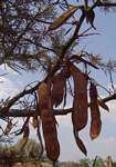 Medium to large deciduous tree. Prickles in opposite pairs, short, broad and hooked. Flowers in long slender spikes, cream to pale yellow, the calyces showing red before the flowers open. The pods are long, up to 25cm, flat and hairless. |