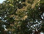 Medium to large, almost evergreen, tree, to 20 m. Bark very characteristic, pinkish-cream with flaking patches of dark brown to black. The dark patches are often very extensive in older trees, giving them a burnt look. Leaves 2-foliolate; leaflets broadly sickle-shaped, 3-10 cm long, very asymmetric, glossy green above, paler below, hairless; apex acuminate. Flowers in lax terminal heads, creamy-white, c. 1 cm in diameter. Fruit a broad, woody pod, only 2-3 cm long, dark brown, splitting on one side only, partially releasing a single brown seed with a bright red aril, which is still attached to the pod by a narrow stalk. |