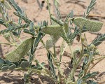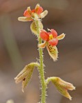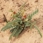 Shortly erect,or decumbent-ascending, shrubby herb with stems up to 45 cm long, growing from a woody rootstock, often with fusiform tubers up to 15 cm long. Most part covered in conspicuous plumose setae up to 2 mm long and with dark glands present. Leaves bipinnate mostly with 1-2 pairs of pinnae and a much longer terminal pinna; leaflets 2-6 pairs on lateral pinnae and 4-12 pairs on terminal pinna, usually oblong or oblong-elliptic, 4-11mm long. Inflorescence up to 12.5 cm long including peduncle. Calyx with lowest lobe often frilled at the apex. Petals,red, orange, salmon pink or purple. Pods obliquely oblong, 1-8-3.2 cm long, straight or slightly curved, densely covered in plumose setae, 3-4-seeded. |