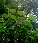 Shrub or medium to large deciduous tree. Bark pale to dark grey, smooth when young, slightly rough in older trees. Leaves elliptic, ovate or ovate-lanceolate, up to c. 20 cm long, fairly thinly textured, somewhat almond-like aromatic when crushed, stellate hairy on both surfaces when young, hairless when older, 3-5-veined from the base, stalked glands present at the base of the leaf below; margin with glandular teeth. Flowers in terminal racemes, unisexual, mostly male with some female flowers near the base of the inflorescence. Fruit 3-lobed, up to 1 cm in diameter, in conspicuous clusters, orange when ripe. |