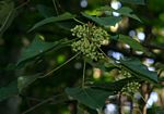 Medium to large tree. Bark pale grey, smooth with whitish horizontal markings; trunk often buttressed in large specimens; branches often armed with short spines. Leaves spirally arranged, broadly ovate, up to 20 × 25 cm, more or less deeply cordate and often peltate at the base, 5-11-veined from the base, densely golden-gland dotted below; margin glandular-dentate to almost entire. Flowers in branched racemose inflorescences, greenish to creamy-yellow, unisexual, on different trees. Fruit subspherical, rarely 2-lobed, up to 6 × 10 mm, covered in yellowish-green glands when young, smooth, hairless and green when ripe. |