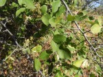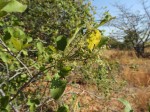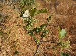 Shrub or small tree up to 4.5 m tall; old branches dull-greyish, lenticellate, glabrous, the younger ones brownish-grey, glabrous or sparsely patent-pilose; petiole 1.5-2.5 cm. long, flat and slightly marginate above, glabrous or pilose; leaflets glaucous or pale grey-green on the upper surface, paler below, leathery, glabrous or sparsely pilose, rounded or retuse, or emarginated at apex with the margin shallowly crenate, median leaflet (2.5)4.5-8.5 x 1.5-5 cm., obovate to subcircular, narrowed and cuneate at the base, lateral leaflets obovate to subcircular, rounded and frequently emarginated at apex, almost cuneate to rounded at base, midrib and lateral nerves raised mainly on the under surface, reticulation conspicuous above; panicles shorter than leaves, lax, with the axis and branches pilose; male flowers: calyx-segments 0.5 mm. long, ovate, obtuse, petals c. 1.25 mm. long, ovate-oblong, obtuse, filaments c. 0.5 mm. long.; drupe yellowish-brown, shining or somewhat pruinose, 4 x 5 mm., compressed, sub-quadrate, asymmetrical. |