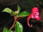 Somewhat shrubby perennial herb, up to 70 cm high. Stems erect or decumbent, hairless. Leaves spirally arranged, ovate-lanceolate or more or less elliptic, 2.5-5.5 cm long, base running into the short petiole; margin finely toothed. Flowers solitary, deep red. Dorsal petal forming a hood; upper lateral petals c. 8 × 4 mm, broadly ovate-elliptic; lower lateral petals c. 5 × 4 mm, broadly ovate; spur on the lower sepal, very broadly trumpet-shaped, gradually tapering, 20-32 mm long, sharply incurved, sometimes slightly bifid at the apex. |