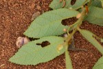 A small, shrubby tree with drooping branches. Branches often with pale lenticels. Leaves ovate-oblong or elliptic, 3-9 cm long, 3-veined from the base, hairless or sparsely hairy above, with dense white hairs below and tufts of brown hairs on the veins; base asymmetric; margin toothed. Flowers yellow, fading to dull orange-red, c. 2 cm in diameter, in few-flowered, axillary heads, petals shorter and deeper colour than sepals. Fruit spherical, deeply 2-lobed, or 1-lobed by abortion, each lobe c. 7 mm in diameter, pubescent, yellowish. |